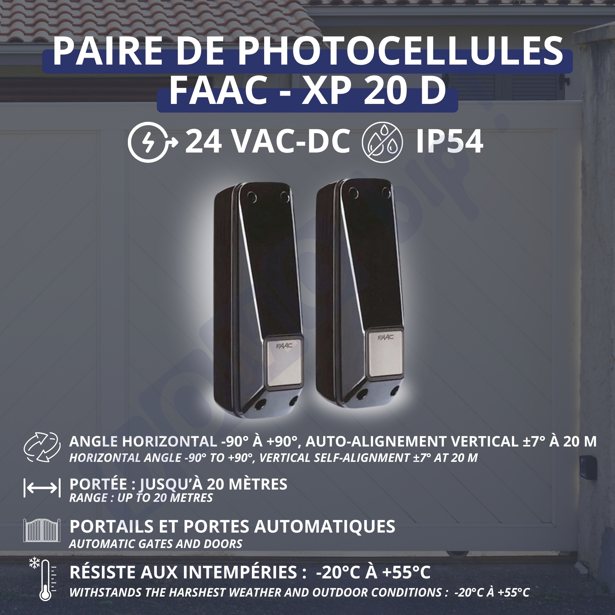 The FAAC XP 20 D photocells are a reliable and high-performing security solution for automated gates and barriers. Thanks to their modulated infrared beam and optical self-alignment system, they ensure precise obstacle detection, providing enhanced safety for your installations.